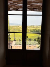 - Living room with fireplace and French doors that open onto a large terrace, offering stunning views of the most beautiful Tuscan landscape