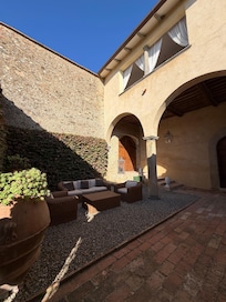 The villa features truly stunning architecture, crafted from ashlar stones that frame the grand entrance and is prominently referenced in the renowned book “Le Ville di Firenze” (Florence’s Villas). Upon entering through the arched doorway, you are welcomed into a meticulously maintained private courtyard, complete with a full set of outdoor furniture, ideal for unwinding after a day of exploring the area.