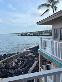 Located on Ali'i Drive our TRUE OCEANFRONT Condominium looks out to Kailua Bay and beyond. Whale watch from the private lanai during the day and enjoy the spectacular sunsets at night. Slab granite counter-top in kitchen with stainless steel appliances. Tile floors throughout living area with 65" TV w/ upgraded cable package. Master bedroom has an oceanview and the soothing sound of the surf as well as a 32" TV. This beautiful condo is also kid friendly with such Amenities as crib/playpen, booster seat, movies, games, beach toys, and boogie boards. So take in the view on the lanai, watch the big game, relax by the oceanfront pool/spa, and enjoy the Big Island.