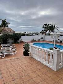 Beautiful Private 4 bedroom, 5 bathroom Villa with a large Private salt water Swimming pool and private gardens. This beautiful villa is entered by a secure entry system into mature walled landscaped gardens, large sun terraces, and a large private pool to enjoy. The villa consists of 2 large double bedrooms, 2 twin bedrooms and 4 bathrooms. The spacious lounge and dining room with its feature fireplace and high ceilings is perfect . The tv room Satelite TV with UK stations. The villa boasts a Master bedroom with walk in wardrobe and en-suite facilities including large shower and beautifull free standing bath with direct access to a private sun terrace from the master bedroom with panoramic views to the sea and the mountains. The property in addition boasts a spacious conservatory. The fitted kitchen, beautifully presented comes complete with Integrated Electrical Appliances. This property also has a outdoor shower room off the garden complete with shower, toilet, handbasin and washing machine. This is a lovely private, fully equipped holiday home located in Corralejo. The pool area has a range of loungers, tables and chairs.. This villa is in a lovely part of Corralejo, yet only 4 minutes walk from the main strip of the town and the 10 minutes from the wonderful golden sandy beaches. The Villa offers a magnificent private outdoor areas where we find a large private salt water swimming pool, large private garden area of artificial grass, so that you can enjoy the the garden and the beautiful private swimming pool and finally an outdoor barbecue with garden table for 6 or 8 people, where you can enjoy any time day or night.