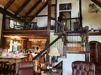 An experience of living in the 18th Century is created by utilizing poplar bark siding, slate roofing, "knock down" finishes to walls, hardwood and tile flooring, a two story stone fireplace, 200+ year old mortise and tenon beams, stone showers, wrought iron accents in stairs and lighting, antique Jacobean style furnishings, electric candle lighting fixtures; all the while blending in modern features such as WiFi, hot tub, streaming television, etc. This timber frame home features a blend of post & beam and timber truss system construction that allows for a soaring 26 foot three story living room ceiling. Wood is the prominent feature of the timber frame and you can not take your eyes off of the intricacies of the detail.