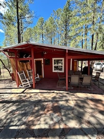 Perfect getaway in the spectacular White Mountains just minutes from Rainbow Lake where you can fish and rent boats. The cabin is nestled among large Ponderosa Pines. The cabin has been recently updated throughout, is super cozy, plus has a large wood burning fireplace for those cold winter nights! The cabin has 1 bedroom with 2 full baths. The master has a full bath with shower and sleeps 3 on a queen and a twin. The 2 couches are pull outs in the family room for additional sleeping of 3. The fully stocked kitchen is open to the dining area that seats six with additional tables outside for seating. A large outdoor gas grill with side burner can be used for bar-b-queing.