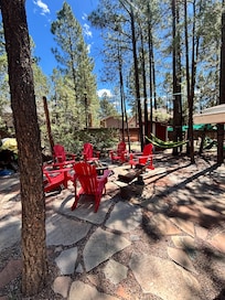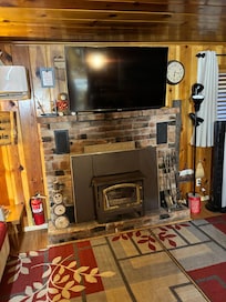 The outside sitting area is beyond amazing for entertaining with a fire pit surrounded by chairs and benches for making those yummy s'more treats. The cabin property has many features such as huge picnic table, hammocks, darts, corn hole, horse shoe pit, swing set for kids, separate dog run and maybe the sight of wildlife. The patio has a table with seating for 6 and 2 rocking chairs to watch the big tv or just enjoy nature. You are literally in the woods with 2 acres to explore for the kids and dogs to run!! If you are looking to get away from it all and have your own peace of paradise this is the cabin for you!!