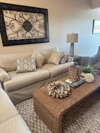 The kitchen shines with stainless steel appliances and granite countertops. A breakfast bar, a cozy table for two to enjoy a cup of coffee, and a laundry closet with a full-size washer and dryer will ease you into a relaxing vacation in this home away from home. Cookware, dinnerware, glassware, and small appliances are provided for the chef in this well-stocked kitchen, including a Keurig and standard drip coffee maker.