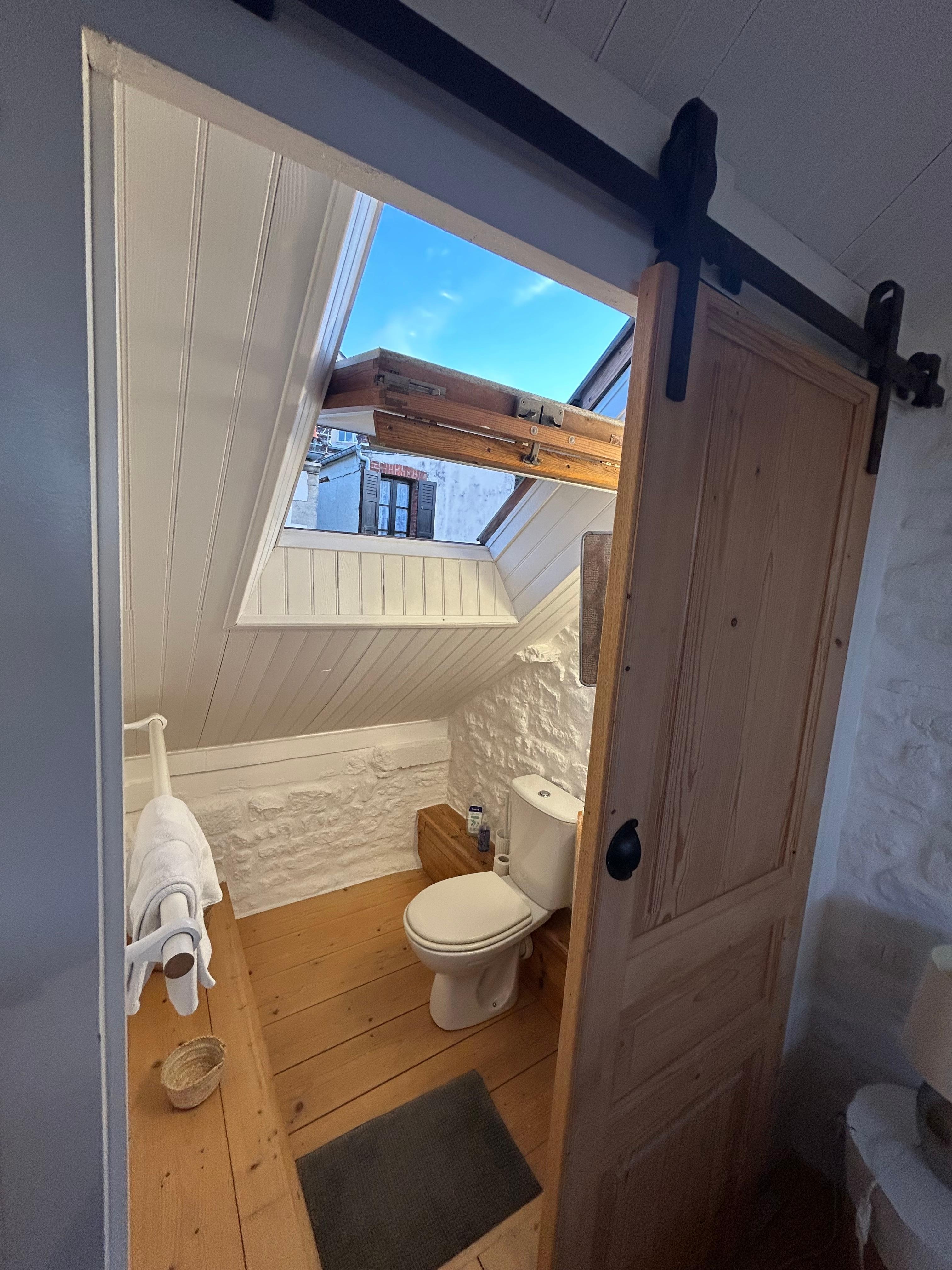 Duvet covers and pillowcases in washed linen, wardrobe and shelves, fan, skylights (Vélux) with sea view over the roofs of fishermen's houses, bathroom with sink and toilet