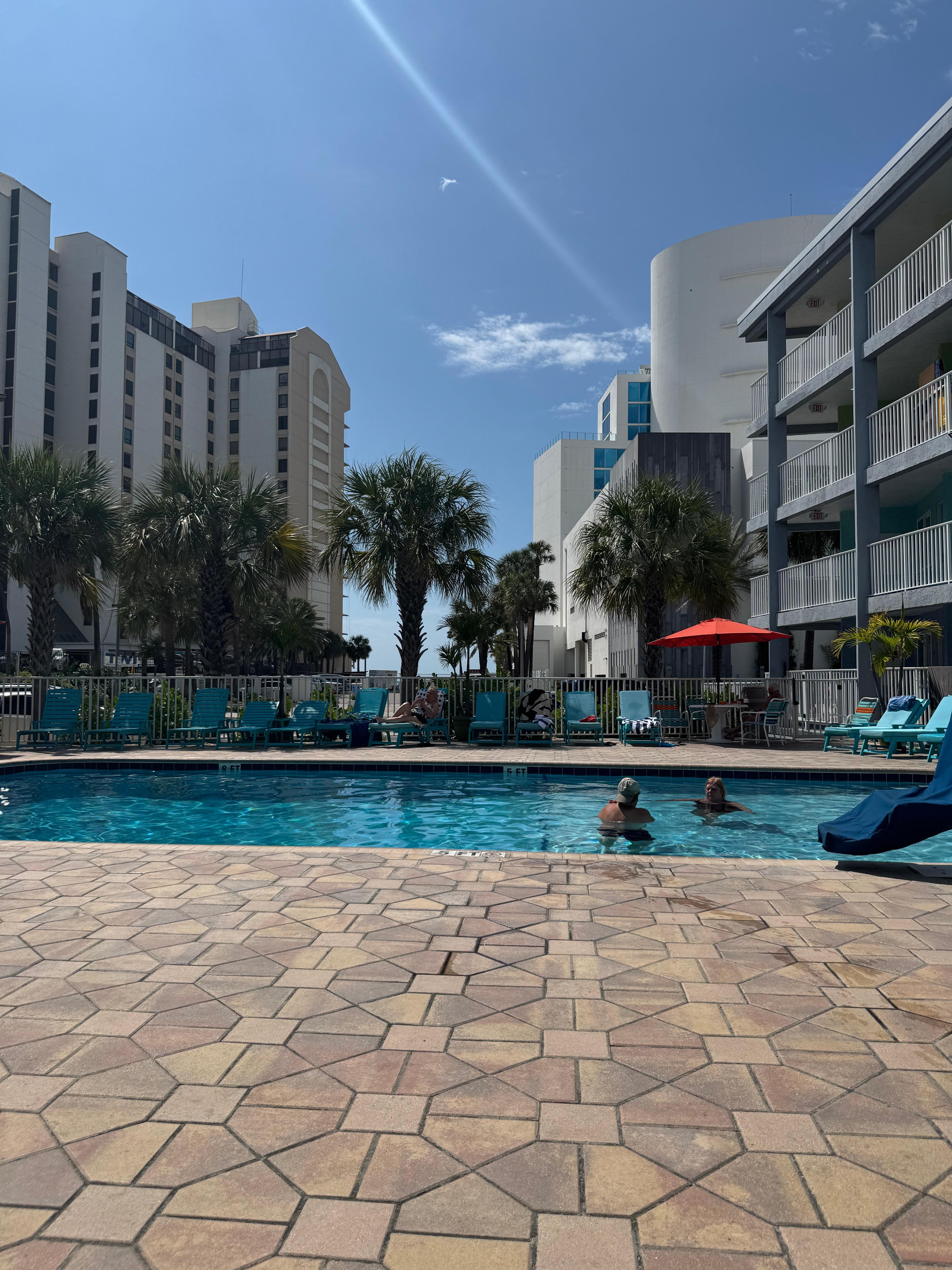 Enjoy the beach life at Pelican Pointe Hotel and Condo. Cozy accommodations with free parking and a heated pool, just a short walk across the street from beautiful Clearwater Beach. Unit #114 is located on the first level, offering a prime location right by the pool. It enjoys the convenience of having a shared patio walkway, which includes personal seating for two.