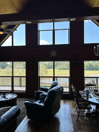 Construction on this cabin was completed in April 2019 in Fort Payne, AL—this is a brand new property, overlooking a beautiful pond, pasture land and a shady wooded area. Perfect for relaxation! This cabin has 2 bedrooms, 2.5 baths, pull out sofa, approximately 1,800 square feet, was built as a private residence. Can comfortably sleep a party of six with plenty of elbow room. Outside amenities include a hot tub on the porch (overlooking the pond), paddle boat, dock, stocked catfish pond, horse shoe pit, walking trails, fire spot, charcoal grill, wrap around porch (covered and uncovered portions), and picnic table. Inside you will find oversized TV above a gas log fireplace, full sized kitchen stocked with pots, pans, and a Keurig coffee maker. Mudroom with washer & dryer, master suite has a jetted garden tub, upstairs has an overlook to bottom story. Fantastic views of pond, hay field, pasture and wooded area. Secluded area where you can watch deer graze and turkeys come and go. Located near Little River Canyon and DeSoto State Park. Our visitors appreciate our proximity to tourist attractions, but our property has so much to offer, why leave?