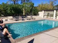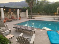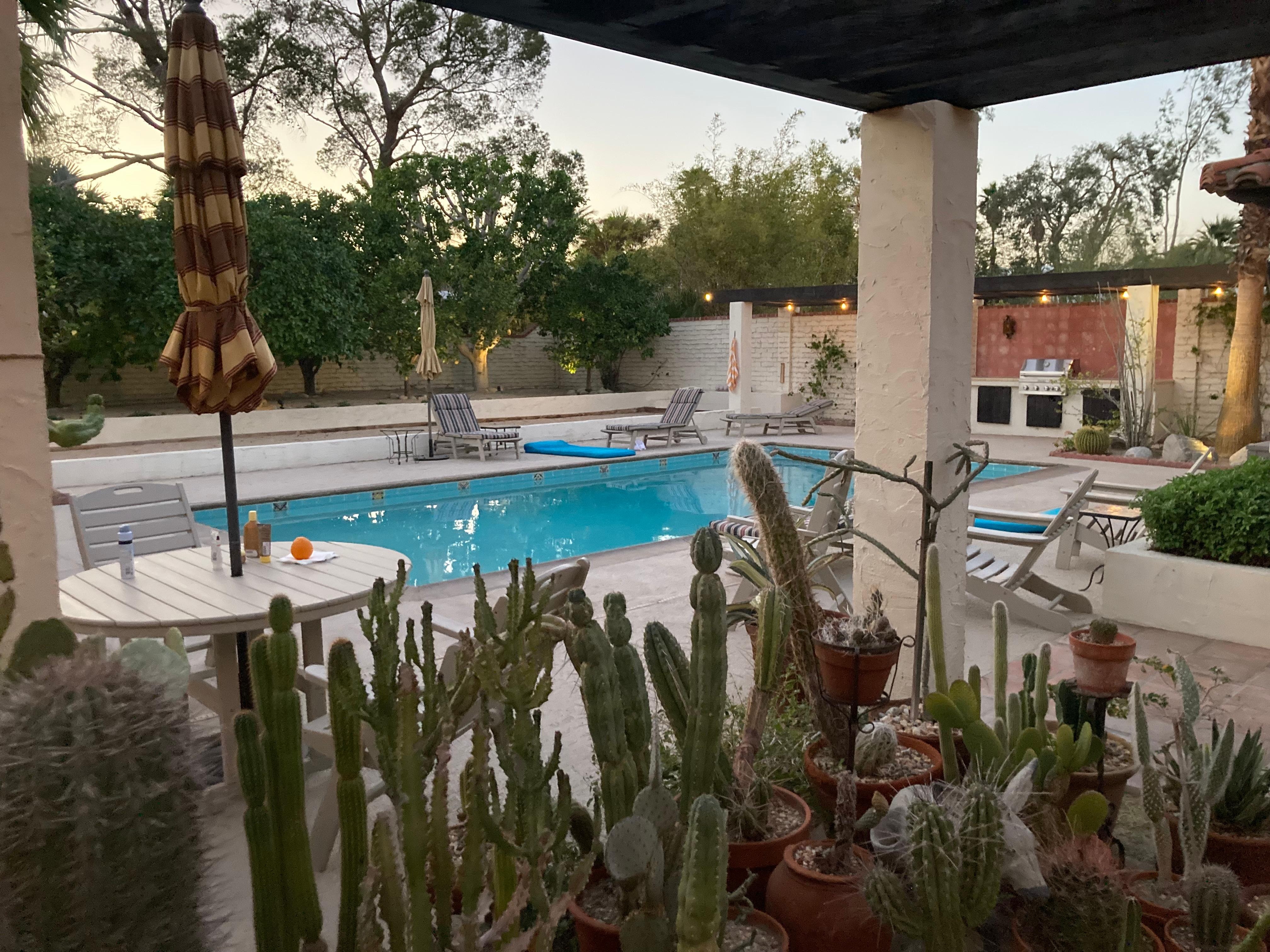 The west-facing backyard and newly remodeled saline (salt) water pool are totally private with beautiful mountain views and a splashing water fountain. Enjoy the spectacular sunsets while sitting under the grapevine-lined arbors, grilling on the large Jenn-Air built-in BBQ, floating in the pool or relaxing with a refreshing drink. The citrus orchard containing orange, grapefruit, tangerine, lemon and limes provides our guests with fresh seasonal fruit. The covered patio contains a sofa, chairs and a table for intimate outdoor dining. There is an additional umbrella-covered dining table for larger groups. There are numerous cushioned chairs and chaise lounges for relaxing in the sun.