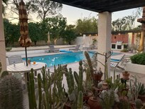 Let the queen bedroom welcome you with a pillow-top bed, luxury linens, robes and a flat-screen TV. Just outside your patio door, you will be enchanted by the tranquil splashing of the water fountain as it entices you to the cactus garden. Our collection is consistently expanding, and we currently showcase over 80 specimens collected from around the world. You just may be lucky enough to witness to one of nature's rare wonders; a cactus flower from one of our many varieties. There are two French doors that lead to the backyard and private patio, which is just steps away from the pool.
