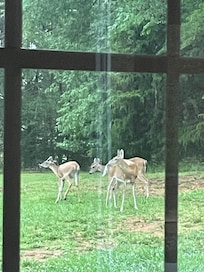 The french door to the back deck is in the sun room. The back deck is 170 square feet and offers guests an entirely different, yet equally pleasing view. It is perched on beautiful rock formations and boulders. Please note that while these rock formations are amazing to look at, they are full of sharp, jagged edges, crevices, and caverns. Please supervise children very closely at all times if they venture near the boulders. There is an outdoor dining table and chairs on the deck as well as a propane grill for your use.
