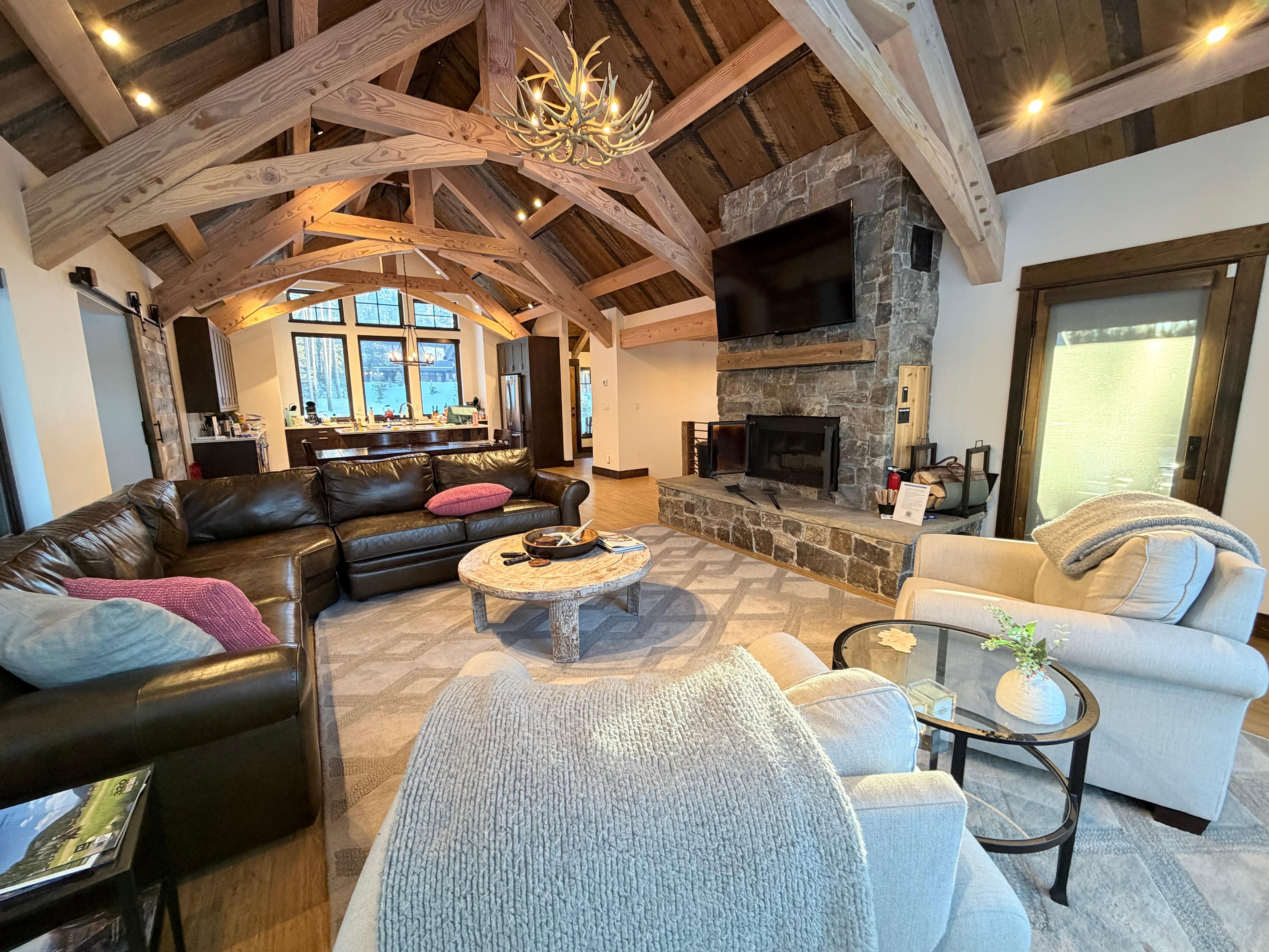 The newly built 2,600 sq ft Spotted Eagle is a stunning display of modern mountain living with high-end furnishings, upscale amenities, and large walls of glass that invite both natural light and breathtaking views that change seasonally.