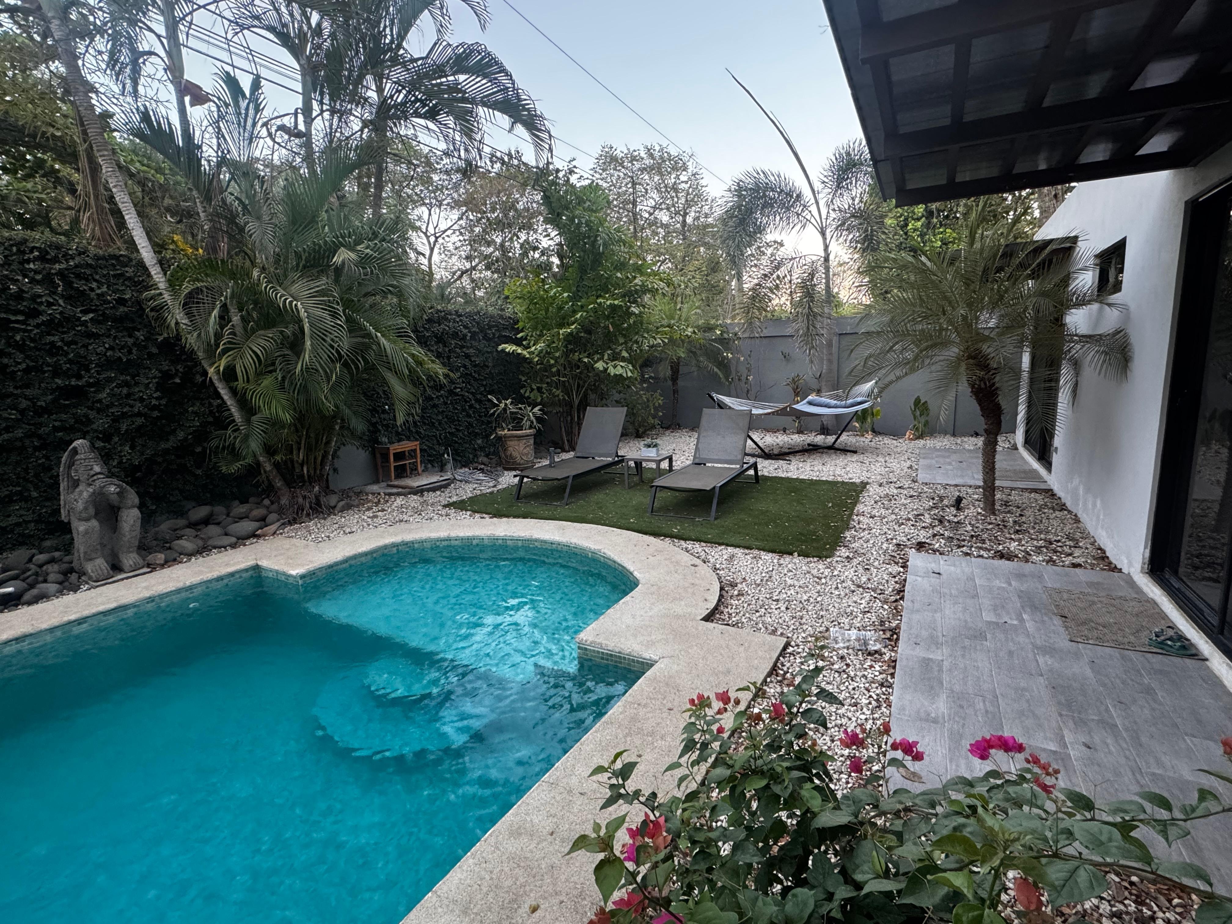 What a fantastic location and place to spend some time everything went great from the very beginning we were greeted by Federico who took the time to explain everything to us and show us through the residents and answer any questions. he met us on time. Communication on arriving was great. The layout and set up for the residents was perfect. beautiful pool which was cleaned every few days . we could clean some of the recent fallen leaves up ourselves with the skimmer. The few leaves would fall in during the day and evenings if windy. the kitchen was very well equipped. the sitting area inside with a large TV was nice to be able to use in the evenings. the rooms were very well kept spacious lots of new fresh Linens. The pool area was beautiful great options for sitting and lounging very comfortable cushion chairs as well as a table if you chose to eat outside and even had a plan outside. The yard had a large cement wall around it that kept most of the dust out of the pool area. There was also a hose if any dusted come in he could easily spray it down with the hose which we did utilize a couple times. It was a quick walk too many restaurants and sodas as well as a easy walk on the gravel roads to the beach which was beautiful of course. Check out was great and easy we loved how it was decorated. One of the nicest quaintest areas and very authentically Costa Rican that we have stayed on we would definitely return thank you for having us.