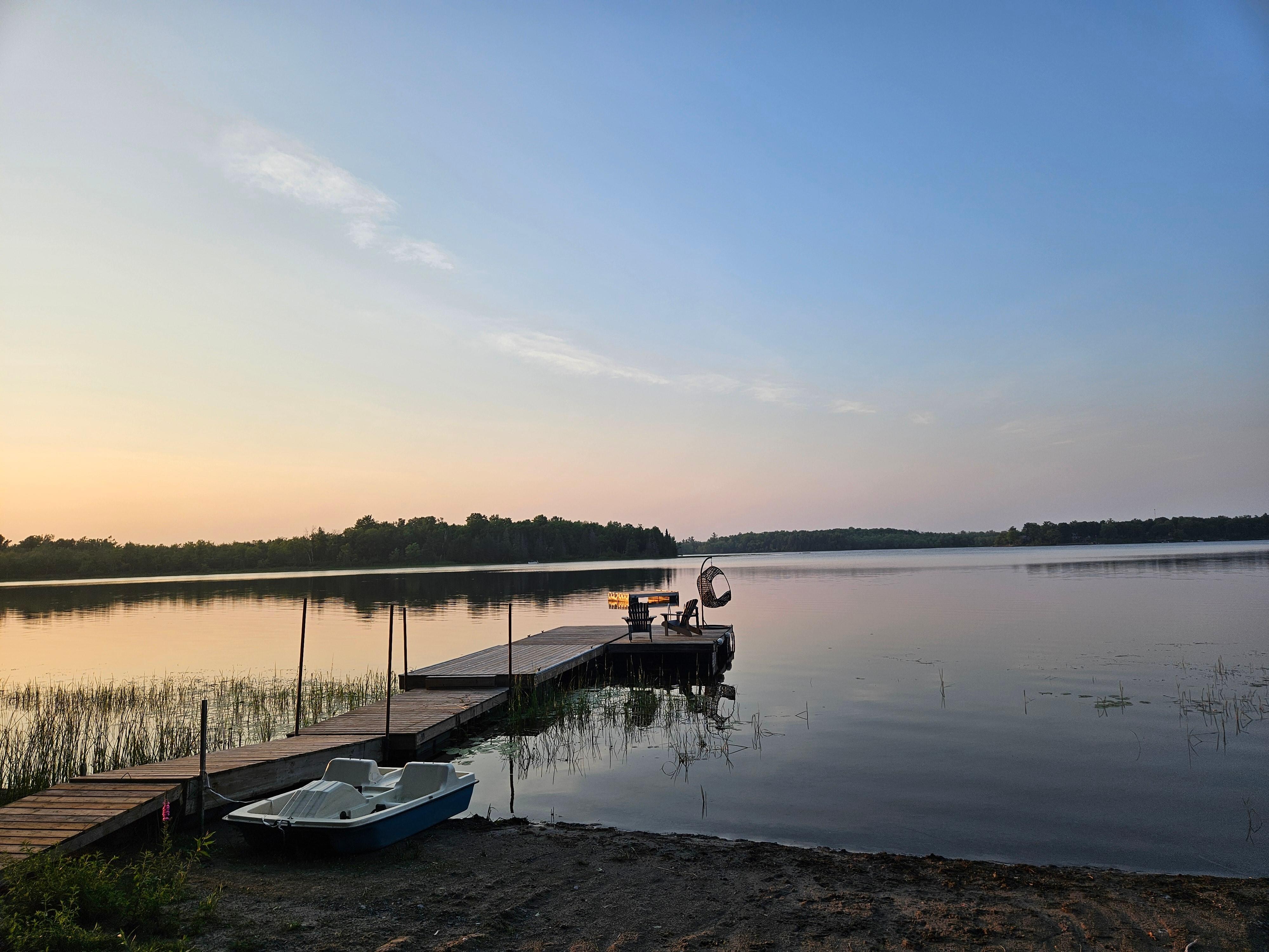 Relax with the whole family, with friends, or as a romantic retreat. This is a peaceful place to stay. Beautiful lake views with amazing sunsets. 1 minute walk to beach and large private dock. Skate park and ATV/Snowmobile trails within 5 minutes, freplace, fire pit and fire table to entertain, fishing, BBQ, kayaks, sandy beach, laundry, baby gates, pet friendly, pack n'play, extra foldout bed, pet-friendly gradual water access, great weed-free swimming. Deck is perfect for entertaining.
