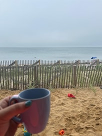 This absolutely stunning condo is truly one of a kind! 75ft from jumping in the ocean. Fish right out of your back door! Stunning water views from every window! It has a large, fully modernized and equipped kitchen with lovely cabinets and updated appliances-including a dishwasher and washer and dryer. This home has gleaming hardwood floor throughout the first floor. It also features two large, second floor, bedrooms which each walk out onto a private deck overlooking the ocean! The master bedroom has its own en-suite bathroom featuring a large jetted tub/shower combo, equipped with a swinging glass door. The master has a king size bed with a new pillow top Sealy mattress and a sleeper chair. The second bedroom features a queen size bed and twin bunk beds. The bathrooms have neutral ceramic tile floors and are bright and white! The kitchen is also bright and white and extremely spacious with many cupboards and oodles of counter space for cooking up a storm! Granite countertop, modern appliances including a dishwasher and ice maker. A farmers sink and modern ceramic floors are two more luxurious touches. There is also counter seating - great for kids having a quick breakfast. There is a large dining area with a large table & six chairs. The main living area is open concept with a spacious living room with a modern fireplace. The living room walks out onto a private deck. We are currently rebuilding the dunes. You can enjoy the view of the sand and sea from the deck but all beach area is accessed through the common breezeway. Beach is not accessible from the bottom deck. There is a barbecue outside on the back deck and also a storage seat full of beach toys. Fabulous "eco friendly" Adirondack chairs to enjoy the sun and sunset! Enjoy daytime beach activities and moonlight walks! We have beach chairs, umbrella and beach matts that you are welcome to use.