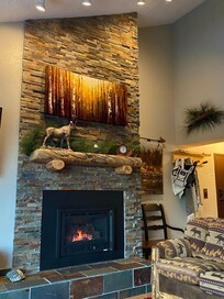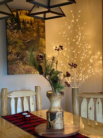 The primary floor plan showcases hardwood flooring that complements the western log furnishings and the vaulted ceilings of the dining area, which is embellished with numerous windows that offer magnificent views and access to a private deck showcasing stunning mountain scenery. The living room provides ample space to unwind on the spacious couches after a day of outdoor adventures, and it also features a Smart TV and a fireplace for added comfort. Please be aware that there is no air conditioning available.