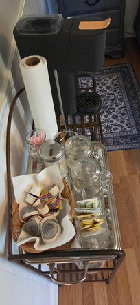 This unit is over 400+ sq/ft and has a full size bathroom, closet, microwave, minifridge, coffee pot and tea kettle. It is furnished with a dining table with seating for two, sofa and 3 occasional tables. All of our guest rooms are professionally cleaned with new linens and fresh towels.