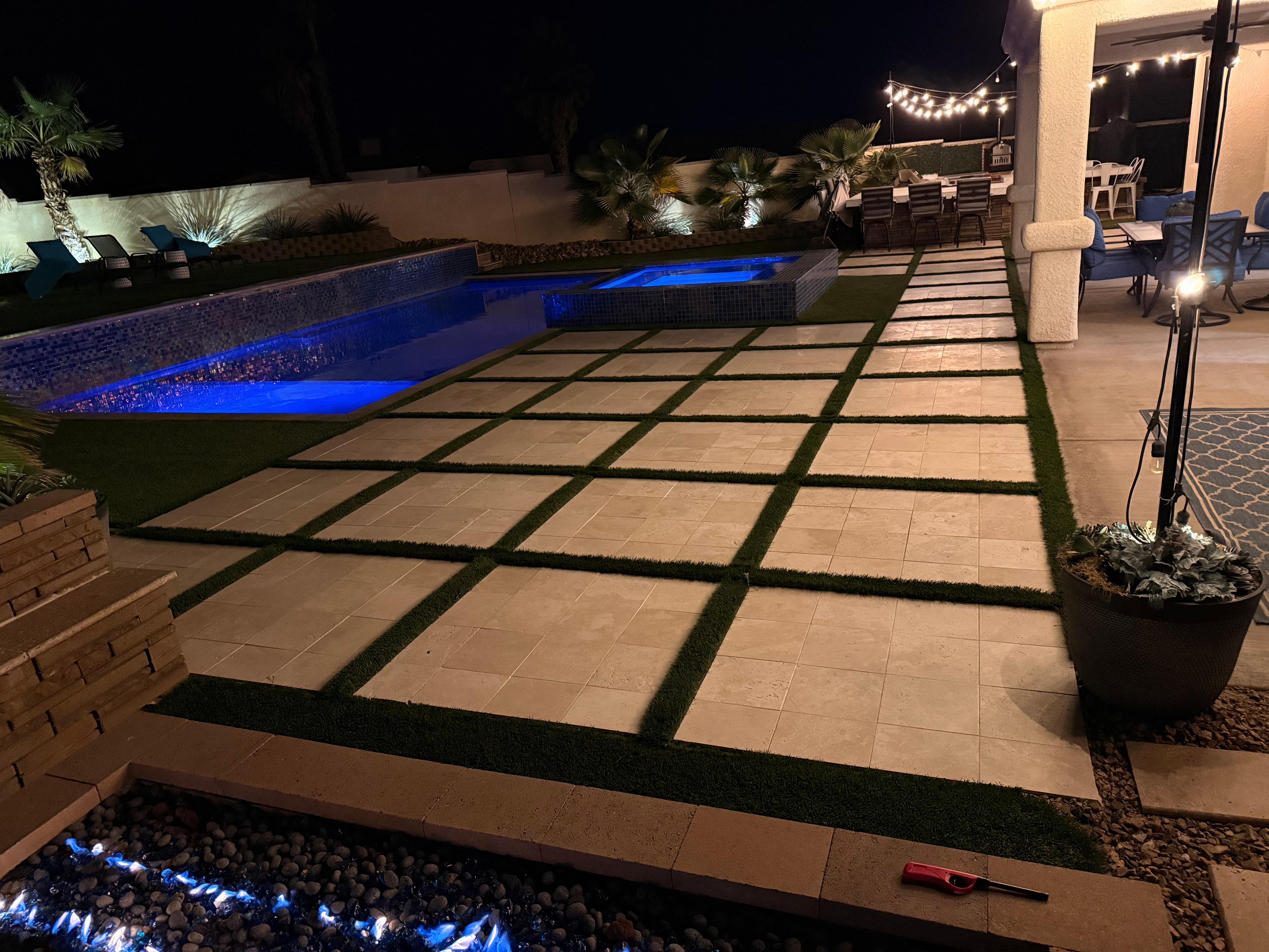 The pool is not your typical Havasu $30k build, it has custom color changing glass tile, large raised rear wall, travertine coping, infinity style spa flowing into the pool.