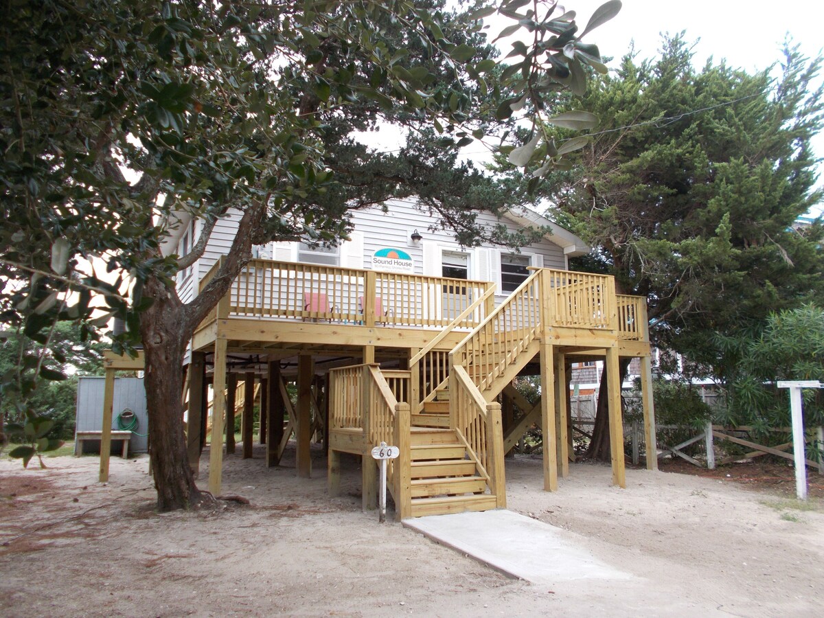 Soundhouse is a sweet, vintage cottage on the usually quiet North Pond with it’s own sandy beach. SoundHouse has been owned by the same local family since 1972. The owner resides nearby. It features a shady front porch and a back porch with a great beautiful waterfront view, including your own little sandy beach. Great for kayaking, paddle boarding, an easy walk to ferry, museum, restaurants, shopping and “downtown” waterfront with fabulous sunset views. Limited to four people, no pets, 3 bedrooms, 1 bathroom, 2 queen beds, one twin, a large open plan kitchen, dining and living area. There is an outdoor shower and washer/dryer, but experience old Ocracoke by washing your dishes by hand, no dishwasher! Parking for two vehicles. Enjoy the soundside beach but please respect neighbor’s beachfront property lines, it’s not a community beach. We DO NOT allow powered or sailboats tied up or moored by guests of SoundHouse. This is strictly enforced. Smoking is not allowed inside SoundHouse. Smoking is allowed outside in the yard only. Events and large parties are NOT allowed in SoundHouse. Do NOT store or charge electric bicycles on the property. There is space and charging available for golf carts.