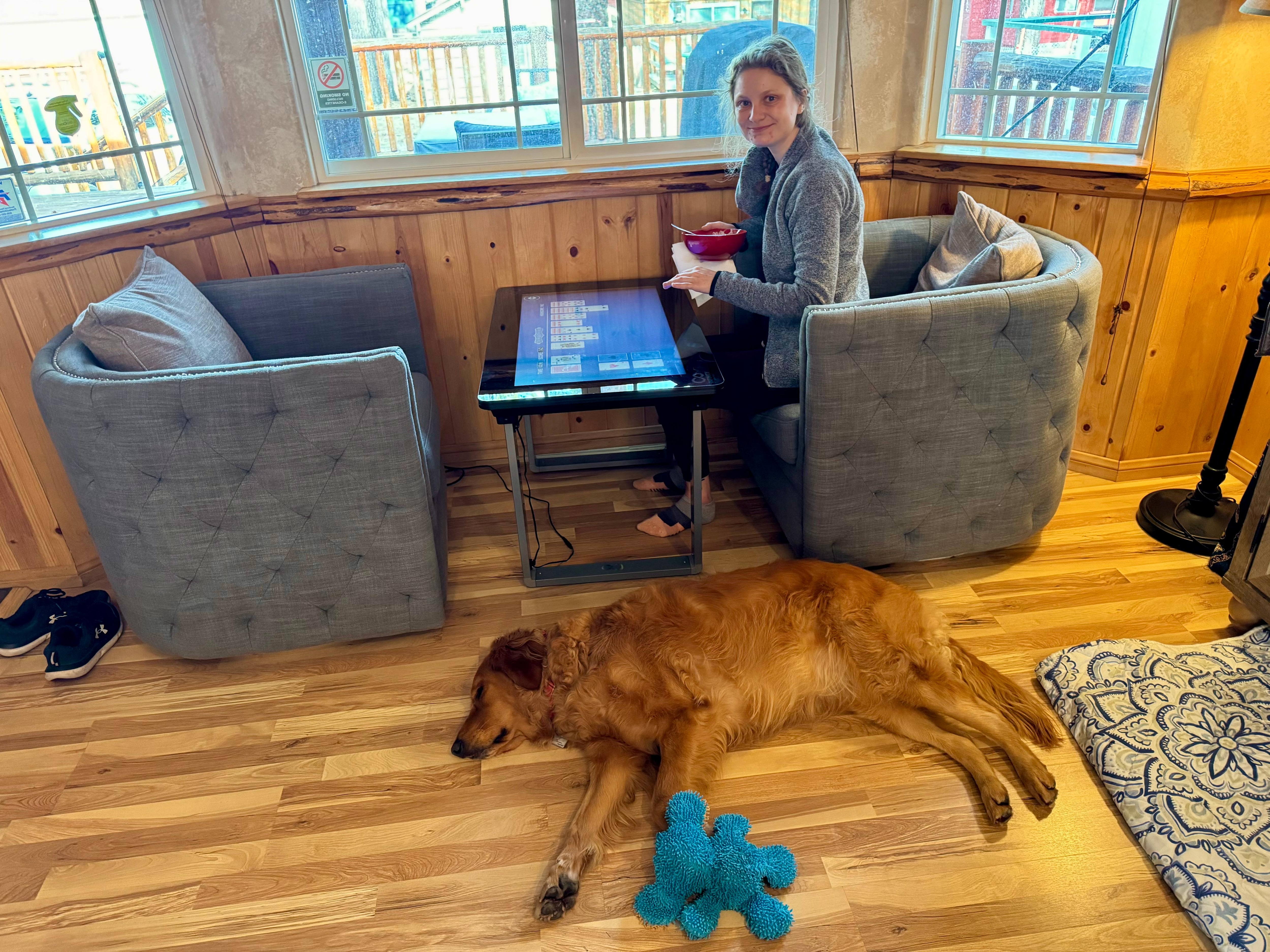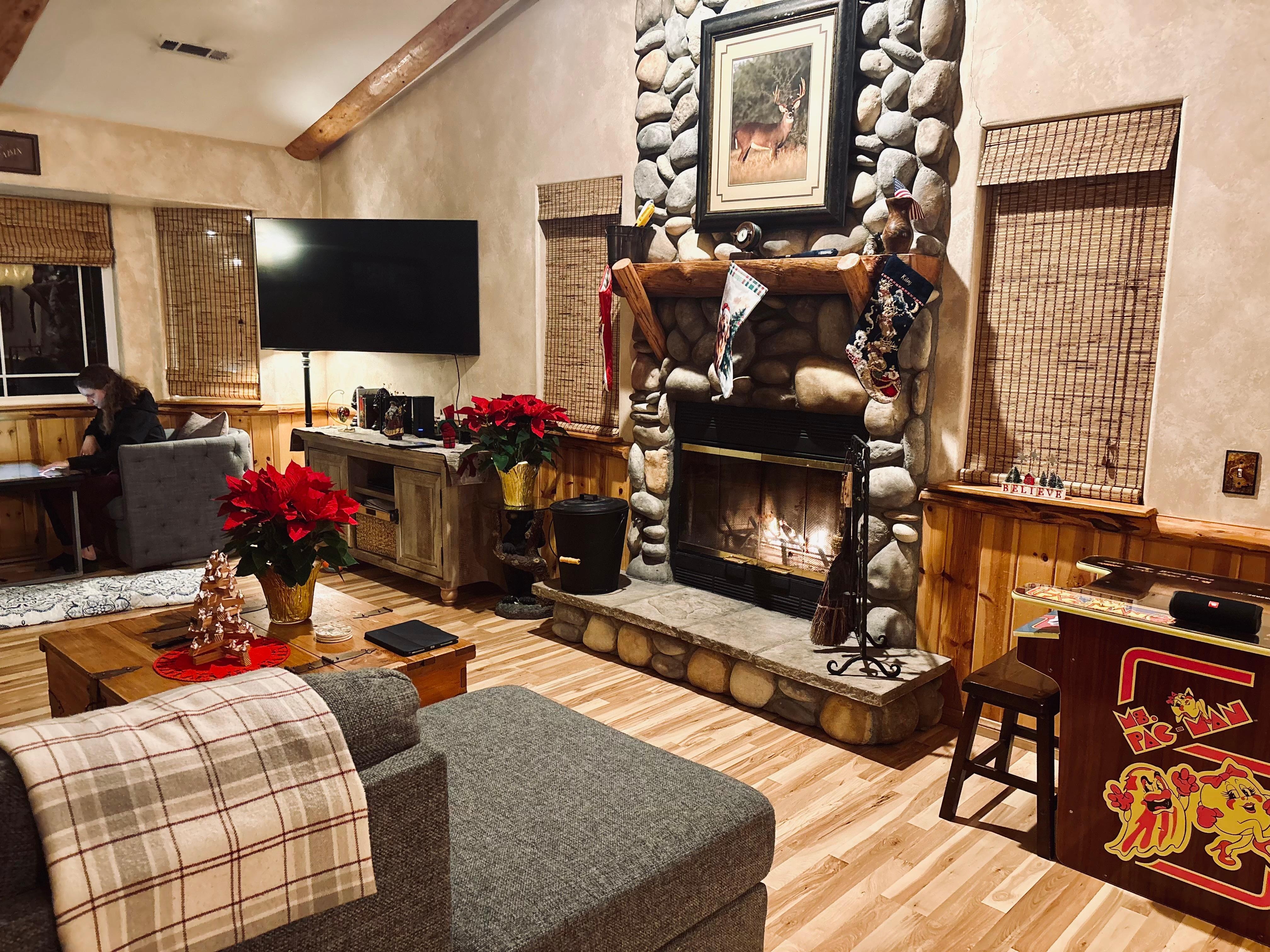 ✓ Family Room: Cozy sectional seating around a wood-burning fireplace, large flatscreen TV with Wi-Fi for streaming, and a vintage Pac-Man arcade-style cocktail table for added fun.