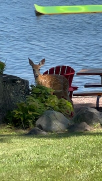 120 ft. of rocky/sandy shoreline | 56' private dock (May - mid-Oct./can tie up boat) | Lakeside fire pit with grill and picnic table for lakeside meals | Small sandy beach area on shore + sand toys | 18' Aqua Lilypad water float | Gas grill | Expansive deck with lounge and dining areas