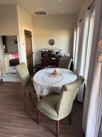 Sweet Happy Place Suite is a very comfortable, spacious and private 530 sq ft master suite in our home. This master suite is part of our home, situated at the end of the home, with a separate, private entrance. The master suite is separated from the rest of the house by a hallway and is completely sound proof. There is a comfy king size bed with a fully organic mattress. Also, there is an oversize chair that opens into a twin size bed. There is a keurig with organic K cups, microwave and a mini fridge all available in the privacy of the bedroom. The bathroom is very large with a jetted, two person tub, as well as a beautiful, large, walk in shower. The toilet is in a separate room within the bathroom. There is a sitting area and a breakfast table with 3 chairs all in the bedroom.