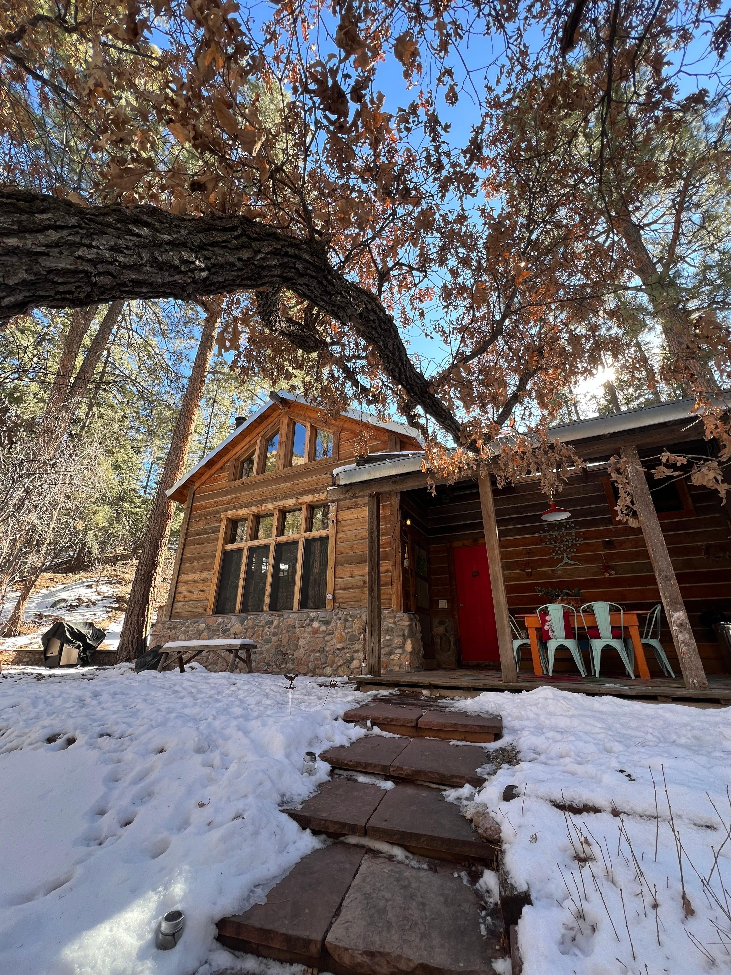 On 1.2 acres, bordering Santa Fe National Forest, Superb mountain retreat, 20 minutes from the Santa Fe Plaza. Exceptional cabin perched on a hillside in glorious Pacheco Canyon. Imbued with nostalgic vintage finishes, filled with hand hewn and hand forged details, the atmosphere is enchanting. Main cabin graced with soaring ceilings and wood-burning stove and quaint kitchen. Upstairs find a cozy loft/ library and second bedroom suite. Add a seasonal stream, majestic canyon views, and access to the wilderness, The Storybook Cabin will not disappoint for those that love a rustic feel, and a peaceful haven to relax and enjoy nature. Perfect for winter sports to include cross-country skiing, other times of the year, trails for hiking and mountain biking right outside your door. 4-wheel drive is a must for the winter months. Please note that we do have exterior security cameras pointed at the driveway for safety reasons.