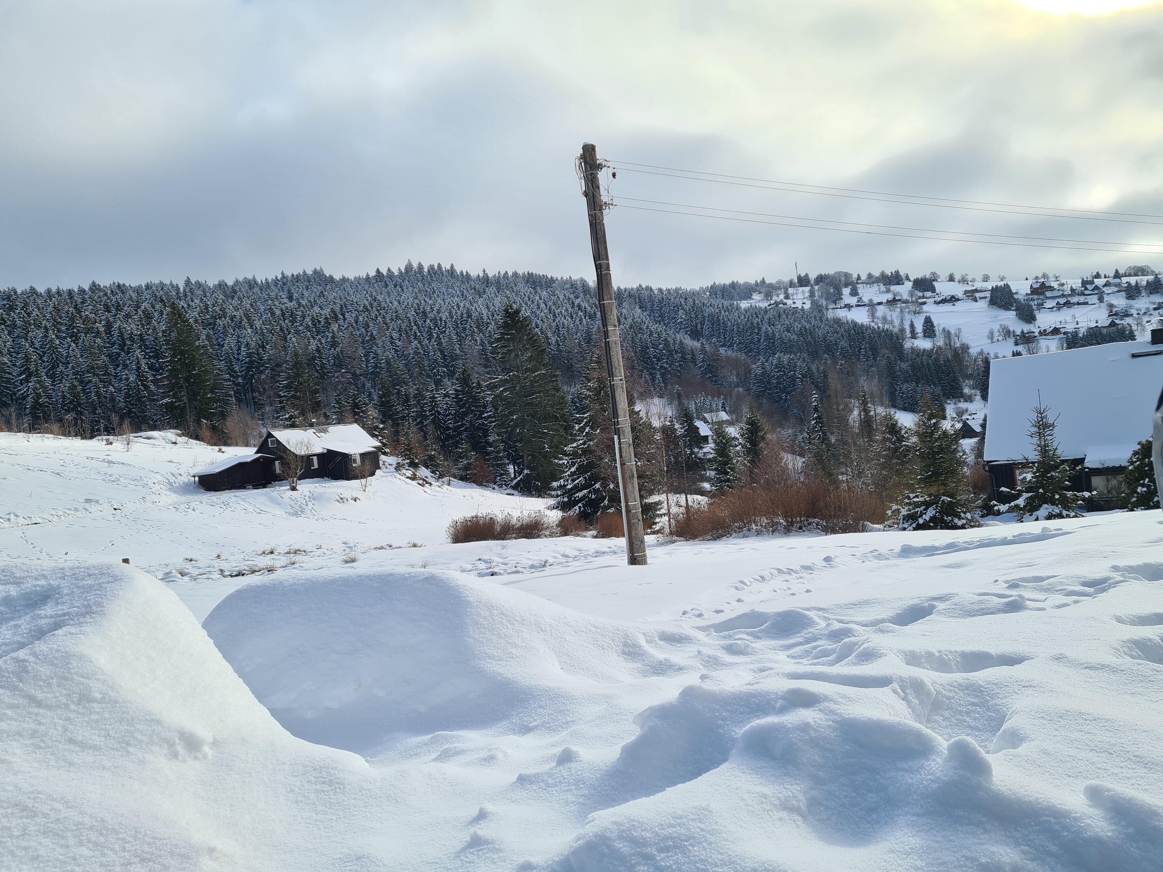 Our cozy mountain hut "Am Scheibenberg" with 72sqm living space is located in a beautiful, quiet and sunny location in the recreation area on the outskirts of Klingenthal, in close proximity to the 936m high Aschberg with direct access to the cross-country and hiking trails. (500m walk to Kammloipe)