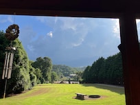 Privately situated, our large one-bedroom log cabin has excellent views, with lots of wide open space around them. Facing the river, with meadows and mountains on all sides, the shady front porch is a favorite spot come rain or shine. The huge grassy lawn slopes gently down to the road. The deck is no longer at the river as the flood took it away.