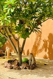 The small "poolhouse" sitting area is located at the back of the garden. You can sit on the bench and admire the lagoon and the pelicans taking flight, which is incredible, especially during the rainy season because the lagoon is high. You can relax while listening to the little birds. As an added bonus, you may even be visited by the little monkeys. We are in their territory, so don't be afraid; we don't feed them.