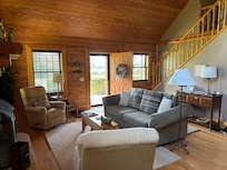 Our beautiful log home provides a romantic, quiet mountain getaway experience. A spacious first floor bedroom with queen size log bed and upstairs loft room with queen size bed provide comfortable, private sleeping arrangements for two couples, or a small family of four. A darling country kitchen provides everything you’ll need including a dishwasher. Relax by the beautiful stone fireplace in the living room or enjoy the tv in the snug while watching deer play just outside the tall windows. After a day of hiking, biking, or rafting in nearby Ohiopyle you can enjoy an evening dining on the back deck, searing some steaks on the charcoal grill (summer months), or unwinding in the hot tub if the weather permits. We also provide a washer and dryer for your laundry needs. In floor radiant heat will keep your toes warm during winter months while central air conditioning keeps the home cool and comfortable in the summer. We are located just minutes from Fallingwater, Kentuck Knob, Ohiopyle State Park, Nemacolin Woodlands, Lady Luck Casino, Fort Necessity, Laurel Caverns, and the Jumonville Cross. Our mobile massage therapist is available for in house massage services by pre scheduled appointment. Please inquire for details.