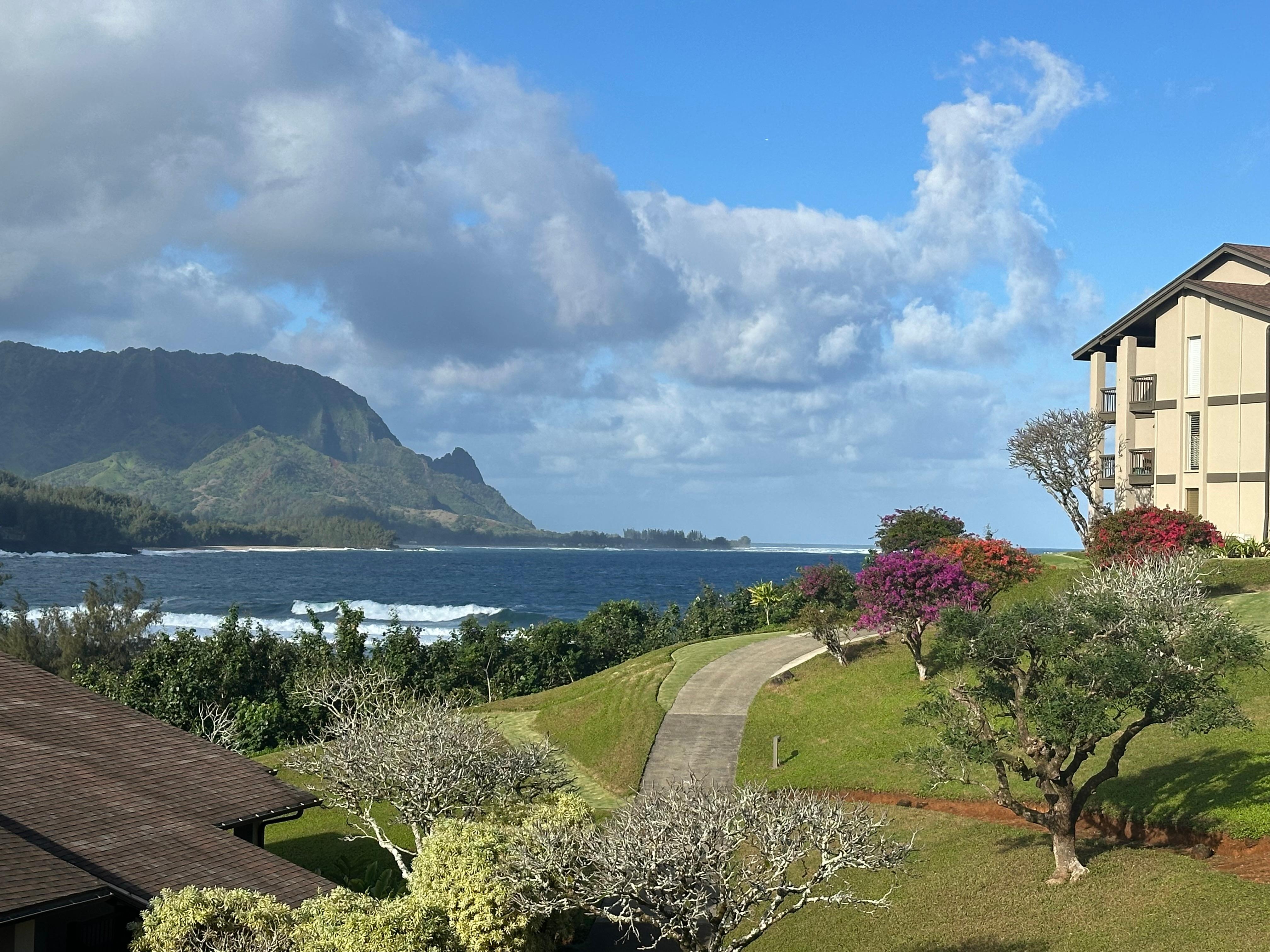 Enjoy the views of the waterfall filled mountains to the west and see the boats come into Hanalei Bay. This large 450 square foot unit is air conditioned, is a non smoking unit, no pets allowed and has recently been repainted and redecorated. There is a mini-fridge, coffee maker, 32-inch flat screen TV and beach toys for you to enjoy.