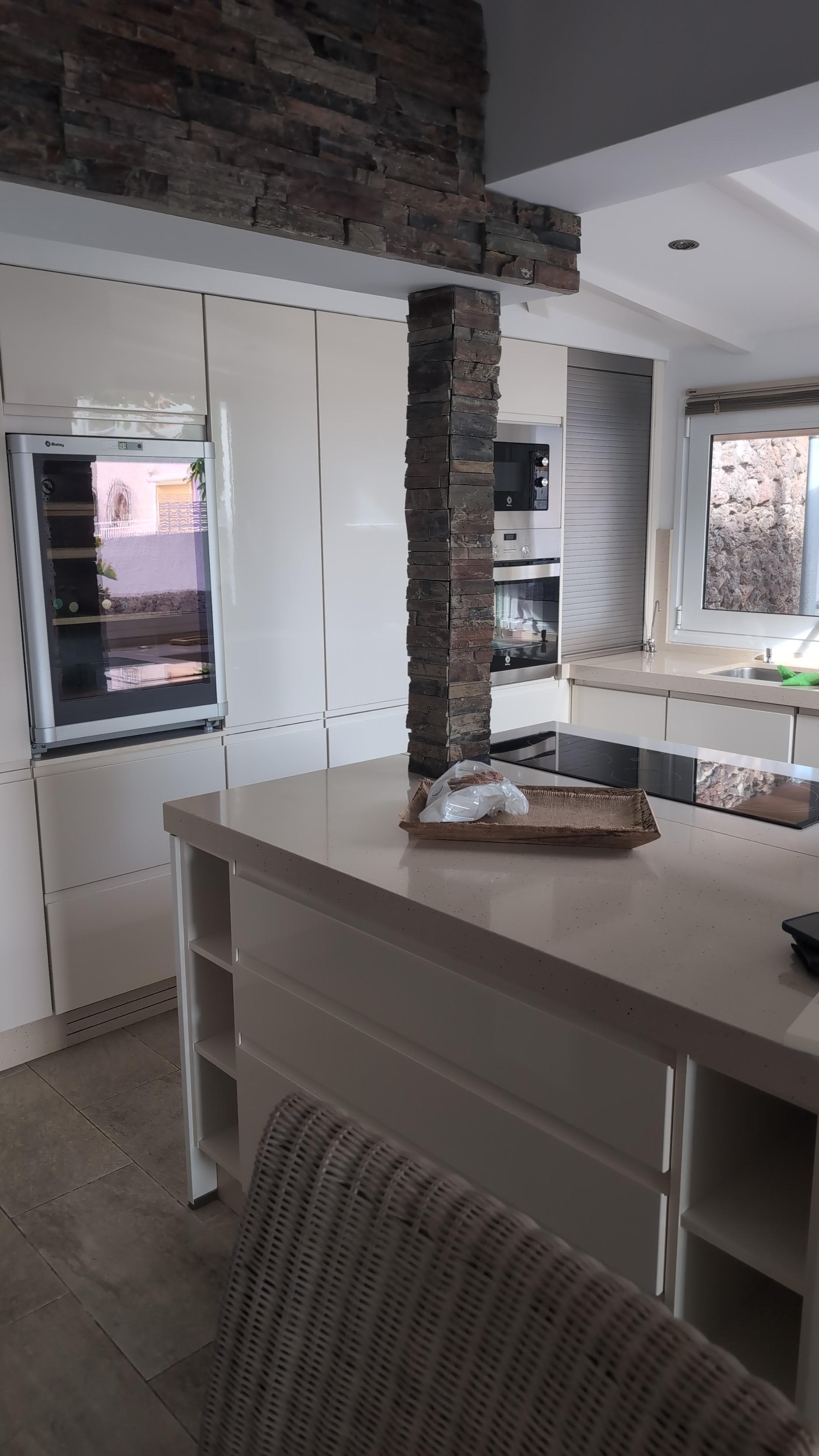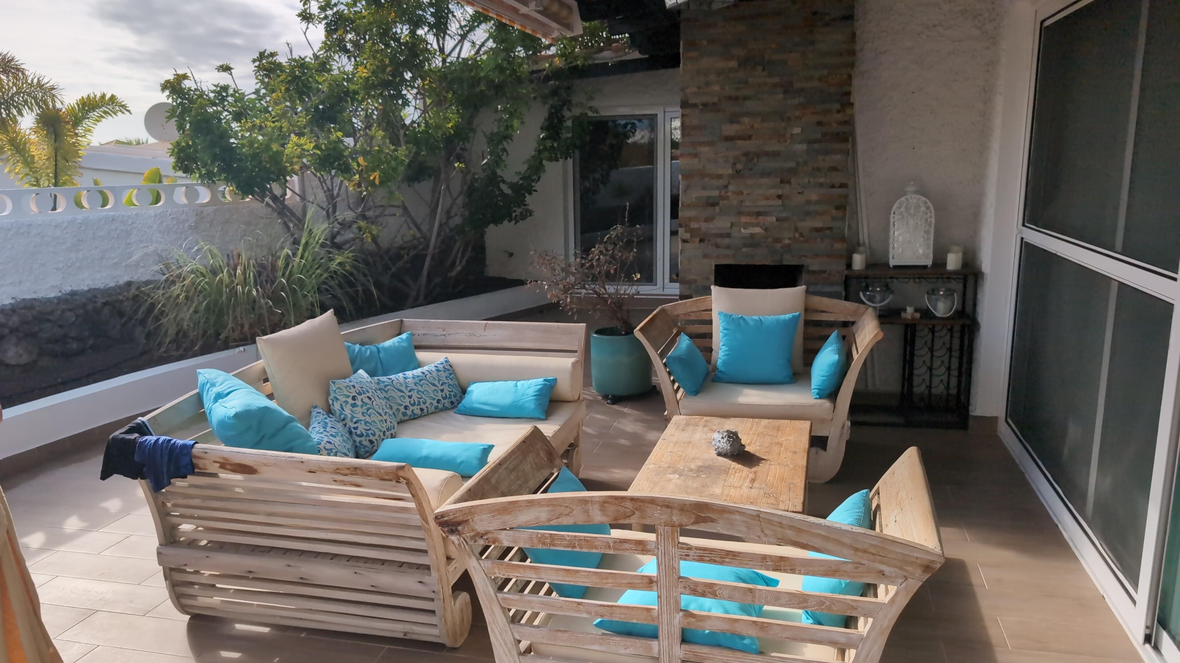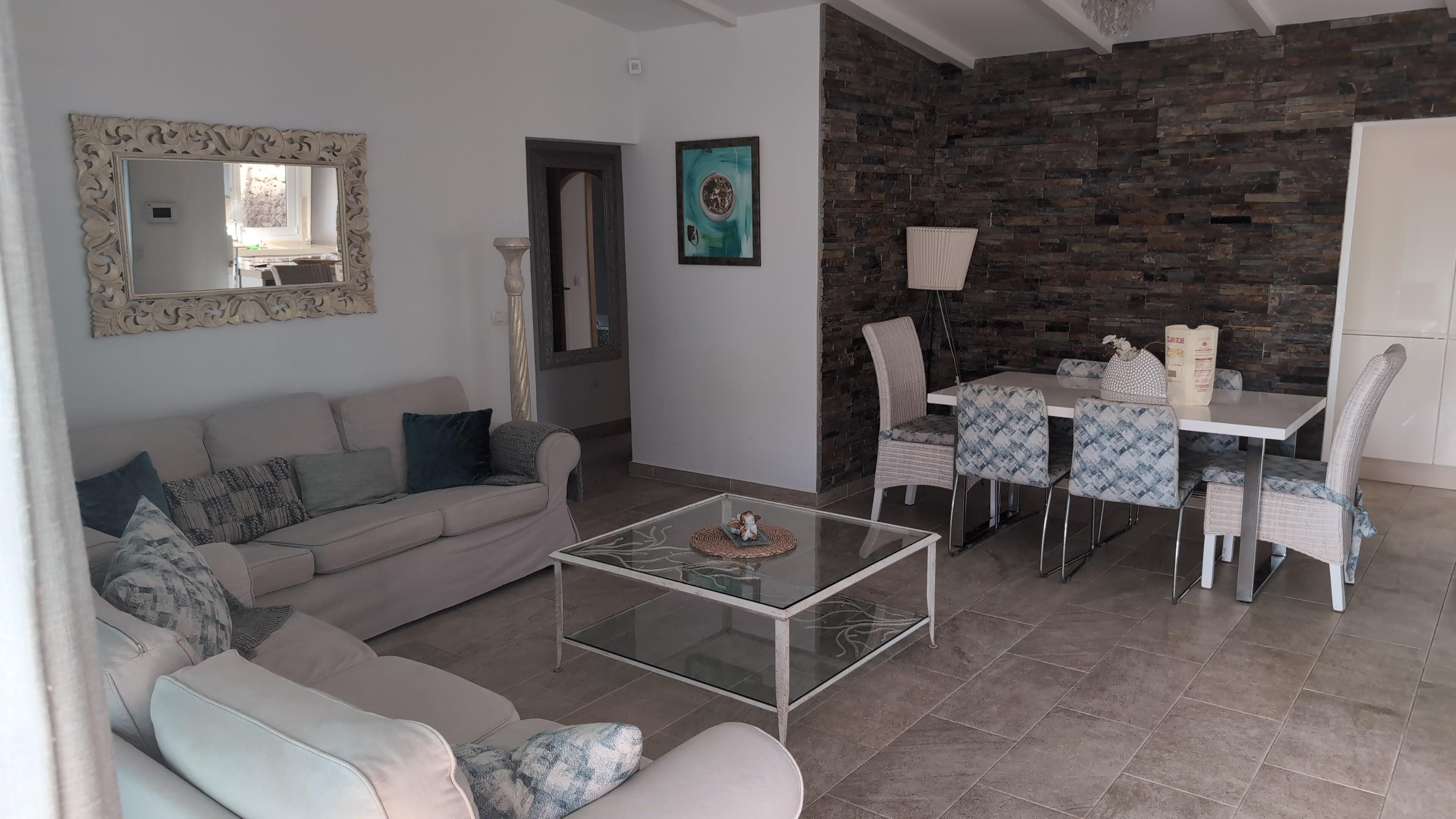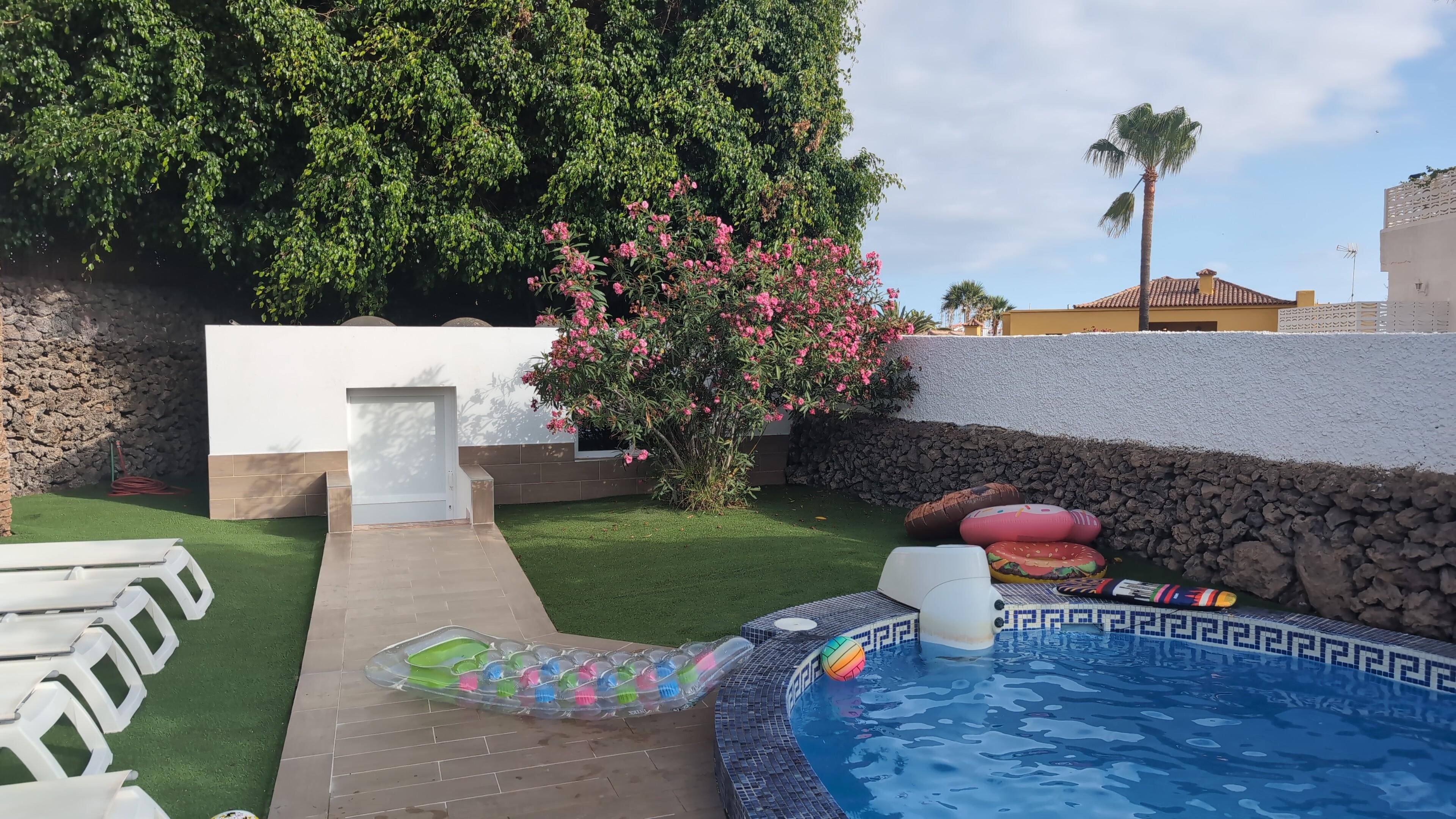 The externally secluded garden, with a nice pool surrounded by palm trees and flowering plants Canarian variety, is the absolute comfort zone and shaded furniture at a small outdoor kitchen and fixed barbecue is for dining outdoors. Also sunbeds and an outdoor shower are available.