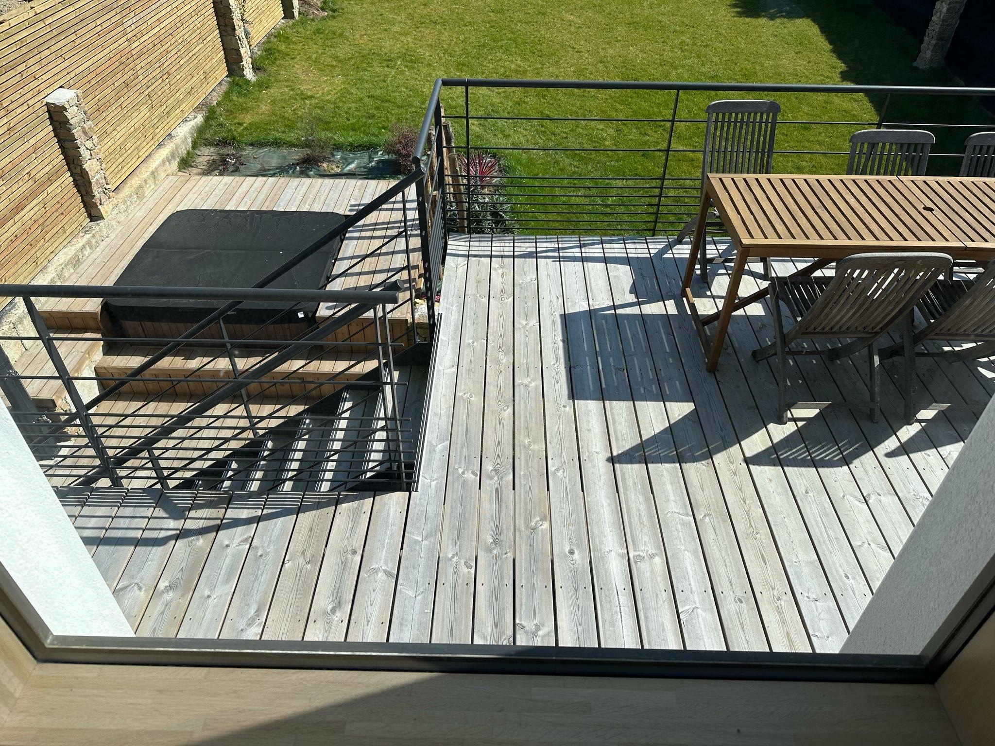 The living space opens onto a raised terrace, sunny for much of the day — ideal for enjoying your morning coffee (or an evening aperitif).