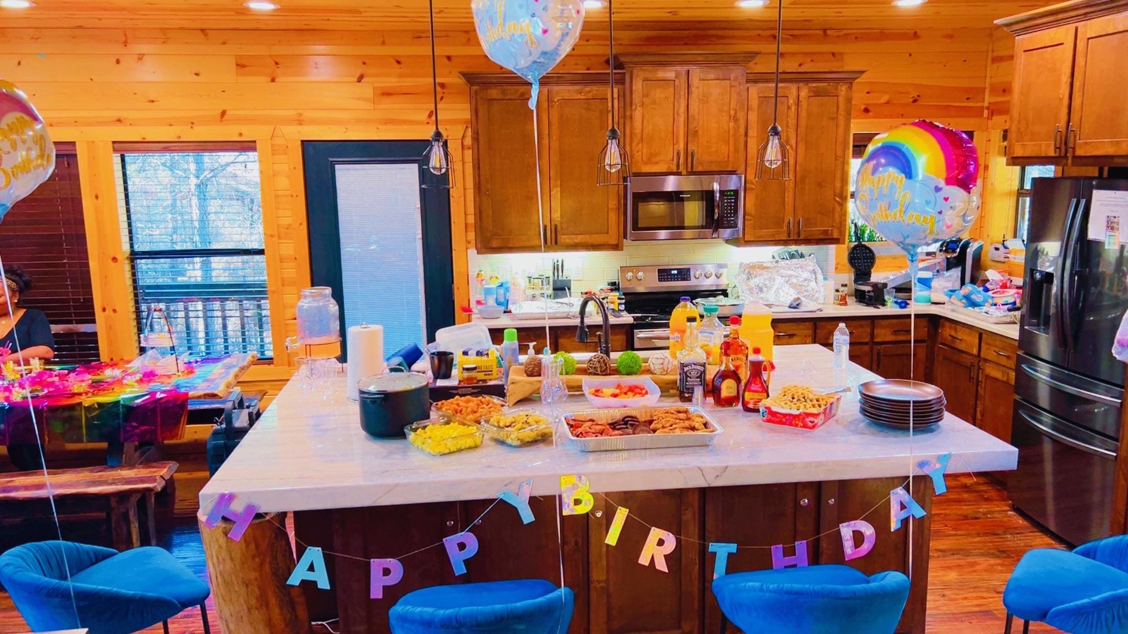 Longshadow Lodge distinguishes itself from other properties with two kitchens, a "sonic" style nugget ice maker, and a massive quartzite kitchen island that is perfect for large family and friends gatherings. Feel like you're up in the trees while relaxing on the huge second level deck with massive two-sided stone fireplace, outdoor living and dining areas with television, hot tub, and BBQ grill with granite prep counter.