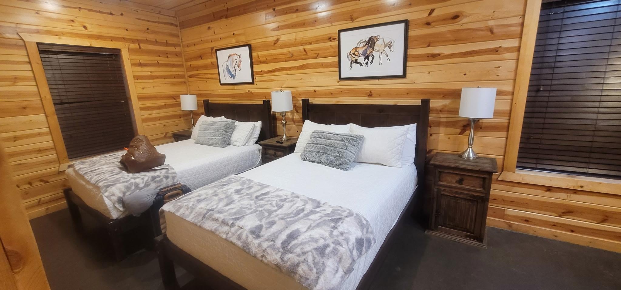 Longshadow Lodge is a beautiful luxury cabin with 7 bedrooms ALL ENSUITE, 7 1/2 bathrooms, sleeps 23! Huge deck with 2 sided fireplace, 2 hot tubs, fire pit, pool table, shuffle board, ping pong, screened in poker porch, outdoor playset, spiral slide off deck, 2 kitchens, arcade games, paved road all the way to property, boat parking, EV charger, FAST internet, half mile to Choctaw Landing casino - backs to national forest but right in the heart of Hochatown to give you the best of both worlds!