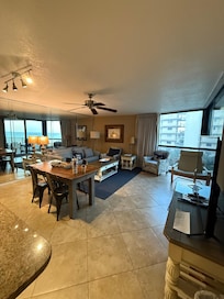 The main living area is bright and welcoming. A large window and sliding glass doors ensure sunshine brightens the room and provides extensive views of the shimmering shores. The glass doors lead to a balcony with several raised tables and chairs. From here, you can enjoy coastal breezes, an ice-cold beer, and laidback conversation with your fellow vacationers. Back inside, the living area has been furnished with comfort in mind. A striped queen-size sleeper sofa and matching loveseat with blue accent pillows give off nautical vibes. The cozy seating arrangement centers around a blue rug and glass-topped drink table. It faces a flatscreen TV, as well as the glorious gulf waves. The adjacent dining area is set against a mirrored wall that accentuates the condo’s spaciousness. Four chairs and a bench seat surround a hardwood-topped table. Beside the table, three saddle-topped stools at the kitchen bar offer extra seating. The open kitchen is perfect for cooking meals, serving appetizers, and mixing drinks. It has granite countertops, a trendy tiled backsplash, white cabinetry, and contrasting black appliances.
