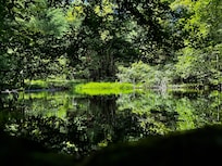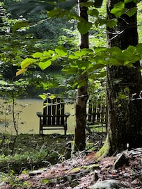 Our favorite feature of the property is the pond, which is a beautiful sanctuary just a few dozen steps down the wooded path. Sit and enjoy a coffee or tea while listening to the waterfall that leads to the stream, watch the birds, look for the bullfrogs at the water's edge, or see if you can spot a deer passing through the woods. You'll be amazed at how much time you can spend doing nothing!