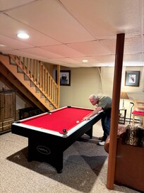 The master bedroom in the upstairs loft features a new king bed, has its own bathroom/shower and provides a lovely view of the woods. The first floor offers two additional private bedrooms, a full bath, and an open concept living area with rich knotty pine walls, gas fireplace, dining area and kitchen. The kitchen is fully equipped, including Keurig, drip coffee maker and dishwasher. You’ll want to enjoy the finished basement that features a second TV, pool table, dartboard, game table, and plenty of games! There's also a washer & dryer available to guests. Bed linens and towels provided.