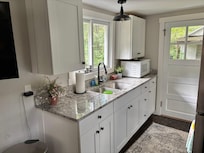 The Kitchen is stocked with dinnerware, cookware, kitchen utensils, microwave, and Keurig. The kitchen, bathroom, and bedroom are all stocked with linens and towels.