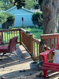 Welcome to our comfortable, updated post-WW2 home with oak floors, brick fireplace, remodeled kitchen and baths and a short walk to downtown and the lake. Well established, quiet area with great neighbors! Enjoy relaxing on our large, multi-level, tree-shaded deck with plenty of patio furniture, tiki torches, bbq grill, picnic table and overhead lighting. Private, fenced backyard with fruit trees and nicely manicured vegetation.