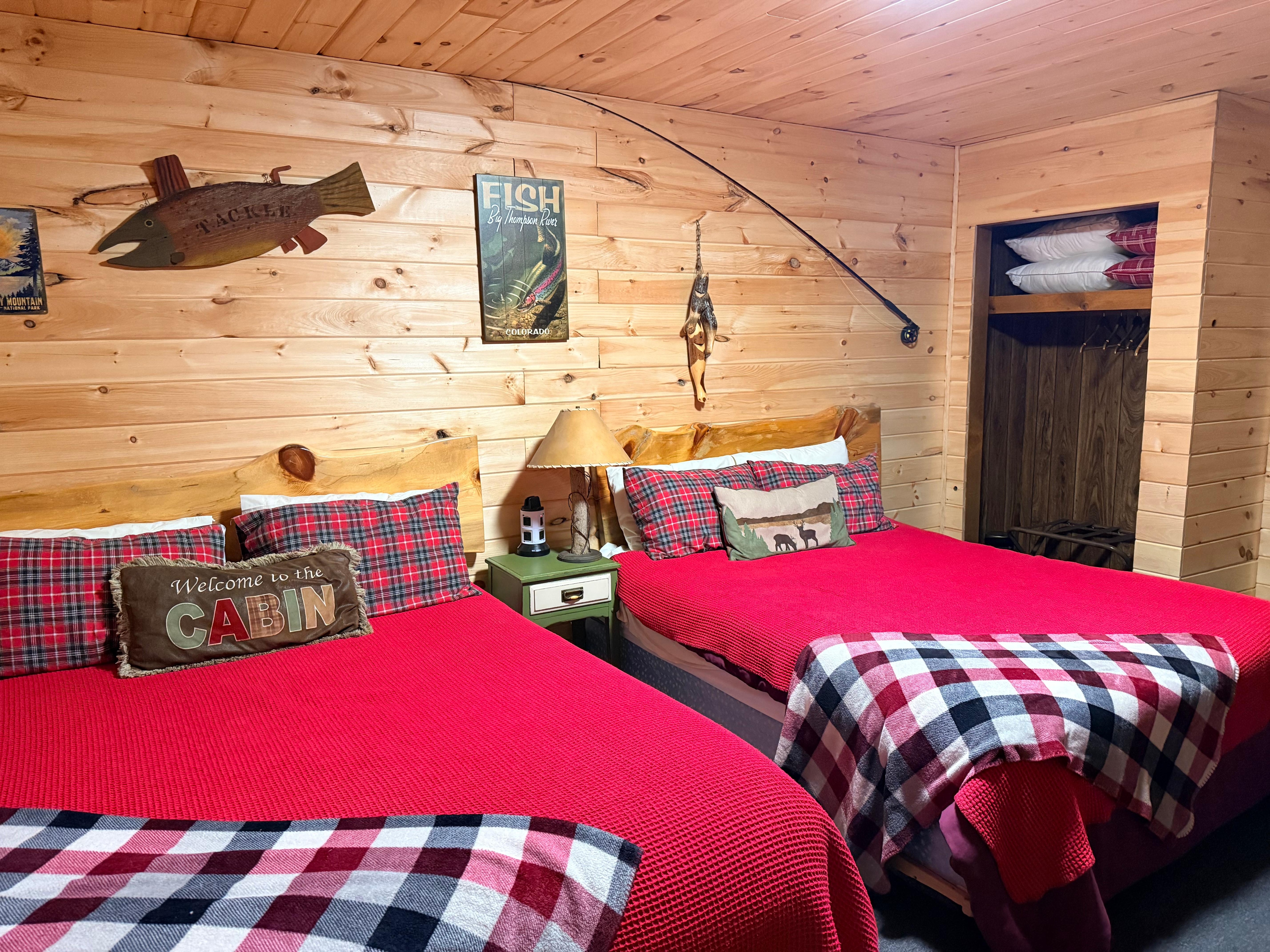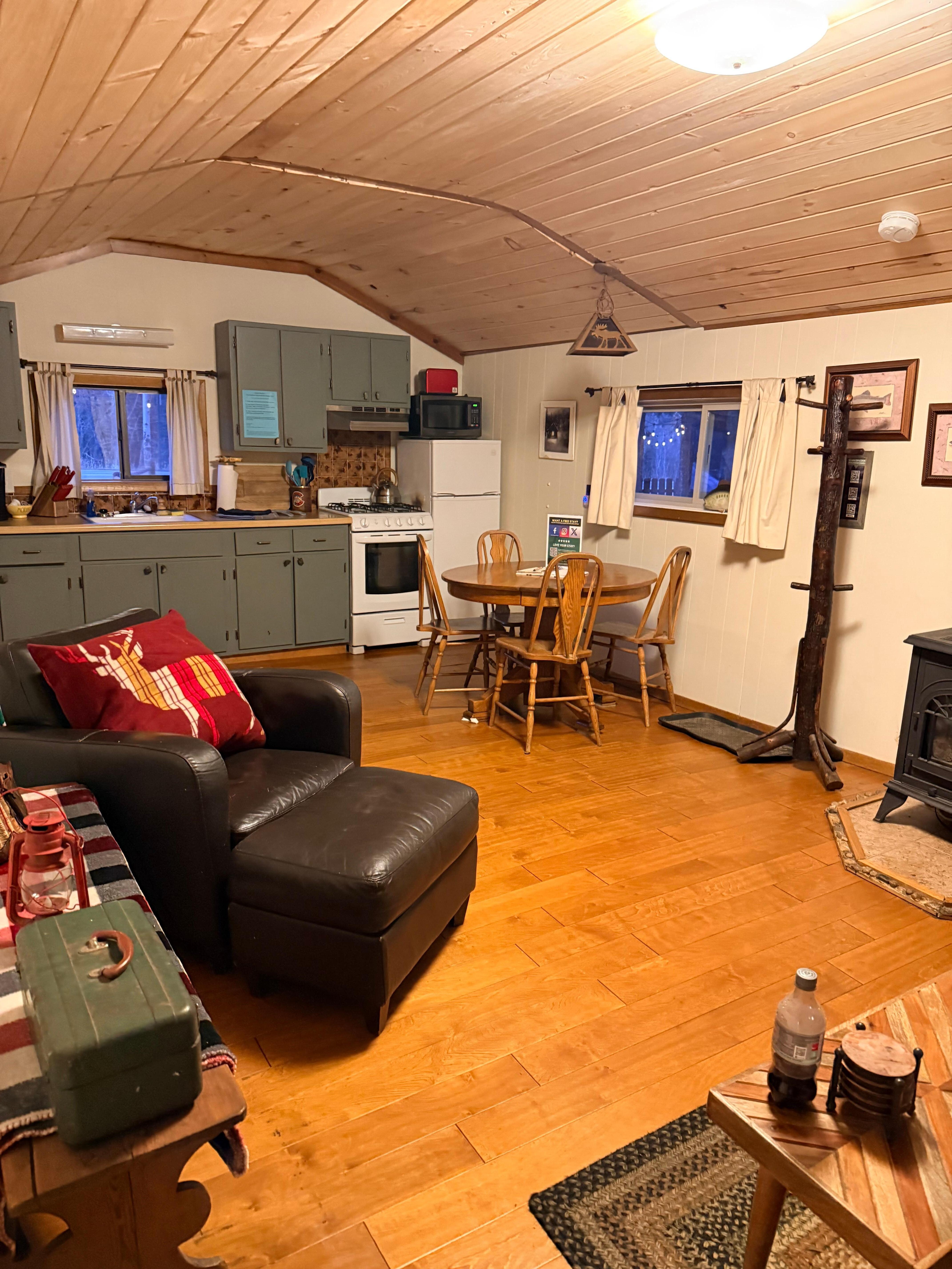 This updated modern rustic cabin has a master bedroom with a queen bed that will sleep 2 comfortably. Enjoy your own private hot tub in front of your cabin, fire pit, amazing views of the river, pine trees, and wildlife. Wi-Fi, Direc-TV, Roku, Keurig coffee maker and a fully stocked kitchen. Fish right in front of your cabin, BBQ, shoot darts, or challenge your loved one to an epic game of corn-hole on our grounds.