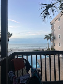 Location is key, and the place boasts amazing views, and is truly right on the beach! Our porch overlooks the ocean and has a large table with seating for 5 and is perfect for your morning coffee, lunch, or evening sunset dinner. Our family has been coming here since the kids were babies. It is a very family-friendly beach! Our unit overlooks both the pool and ocean.