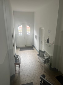 The apartment on the first floor of our charming guest house Berlin offers you very good transport links and proximity to the city, but also peace and relaxation in the "green". You live in a 2-room apartment. The living room is furnished with a comfortable large sofa bed and an open kitchen. The highlight of the living room is the large window front over the entire length of the room with a view of the garden and the parquet floor. The spacious bedroom for four people is divided by a partition to create more privacy for you. On one side of the room there is a large double bed, the other side of the room is equipped with two single beds. The bedroom also has parquet flooring and offers enough storage space. The spacious bathroom with a large window has a bath. All rooms have been renovated and renovated. On the south side of the 2-storey beautiful brick house (built in 1903) is the garden, which you can of course use. Seating under wild wine invite you to linger. Younger guests are also very welcome to play in the garden.