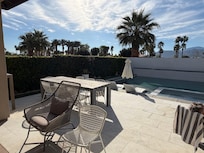 The floor to ceiling stackable sliding glass doors open up to a create an indoor/outdoor experience. The California room is a private outdoor desert paradise with something for the entire group. The beautifully landscaped backyard features an outdoor dining table (seats 8), couch seating area with a 65` outdoor TV, a fire pit, built in gas BBQ that has bar seating. The large pool has a swim up bar with 4 in-pool seats and Baja/tanning shelf with in-pool loungers. Cornhole is also available for setup on the turf side yard.