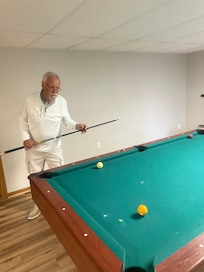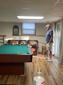 Perfect getaway for family and friends. Relax in the large living room with wood burning fireplace and attached sitting area. The home features 5 bedrooms. The main floor has the living room/sitting area, kitchen and dining area, 1 queen bedroom, a half bath and a walk out deck with gas grill. We have added a full bath with shower to the main floor bedroom, for those who have trouble with stairs. The second floor features the master bedroom with electric fireplace. It also includes his (shower) and hers (tub) full baths and a patio overlooking the beautiful backyard. It also has a king bedroom and large bedroom with 2 full beds separated by a full bath. The basement includes a large media room, game room with pool table, a bedroom with a full size bed and full bath. The laundry is also in the basement.