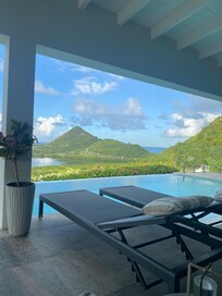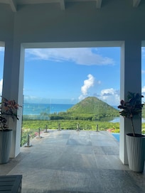 The infinity pool overlooks the stunning, glistening Caribbean Sea. All the bright blue colors will take your breath away. The islands of Montserrat, Redonda, St. Kitts, and Nevis can be seen if the day is right! The large terraces provide both shade and sunning locations, designed for all the comforts you could need for lounging, visiting, dining, sunning, or private places to enjoy your morning coffee or read a good book. Outdoor living at its best!