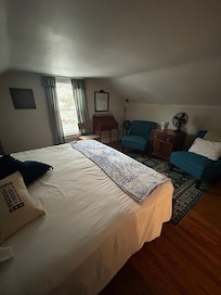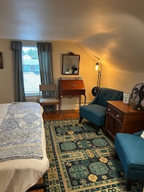 At the top of the stairs you will be greeted by a generous king bedroom with reading chairs, a desk, and a full bedroom. The bathroom offers a walk-in shower and is stocked with essentials for your stay.