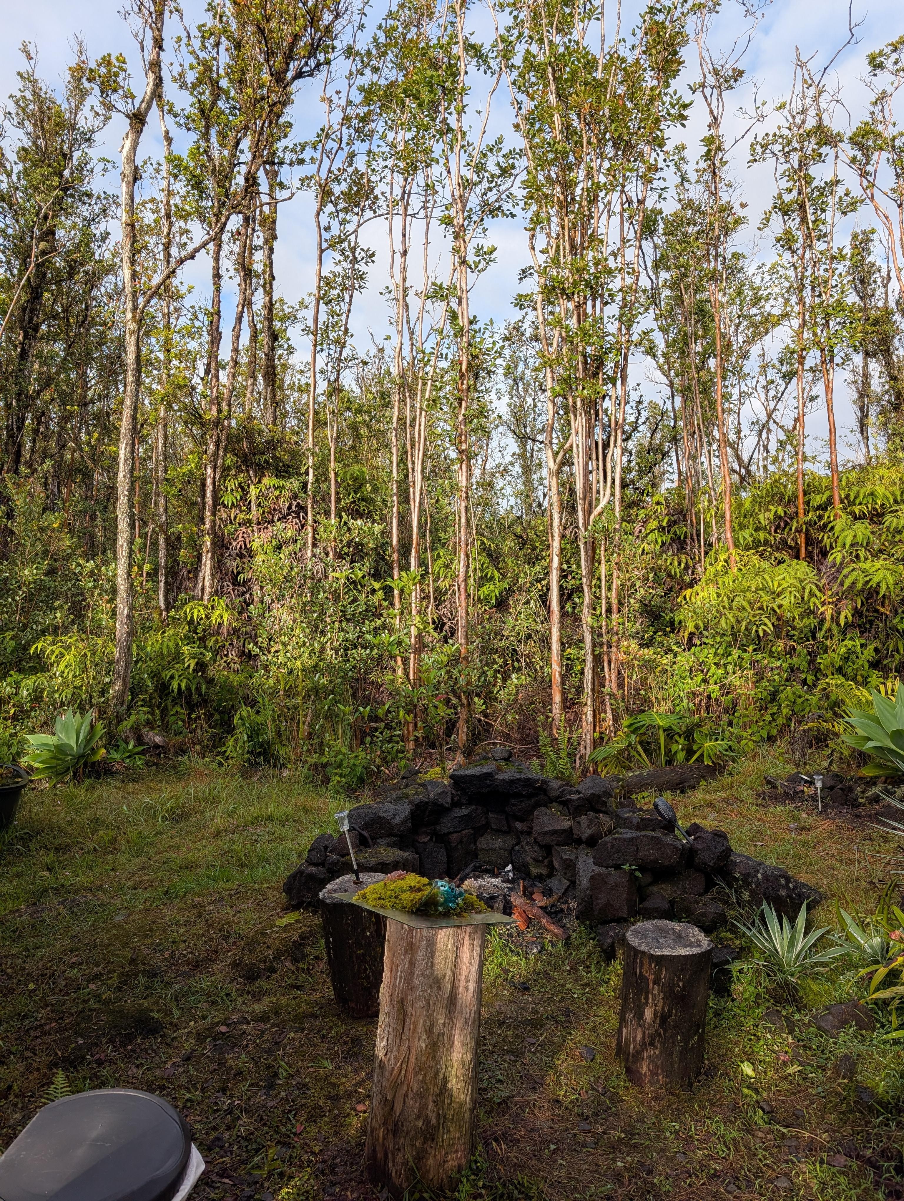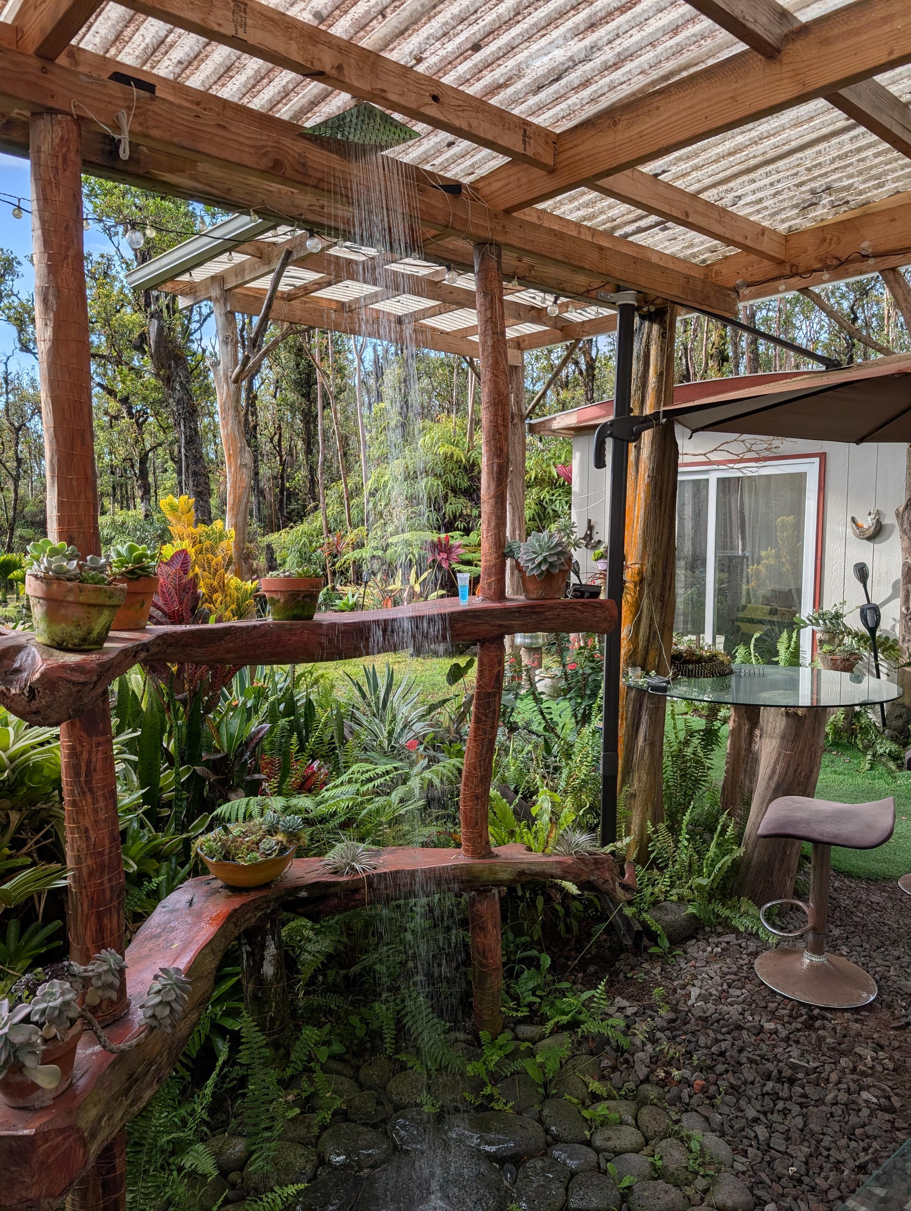 While our cabin is rustic, we have ensured that all modern creature comforts are provided. Unplug and enjoy the ultimate luxury of life - beautiful nature, with your loved one by your side. Our one-of-a-kind outdoor rain shower is created with a hundreds-year-old Ohia log and large, smooth lava pebble stones, surrounded by all kinds of succulents and tropical plants.