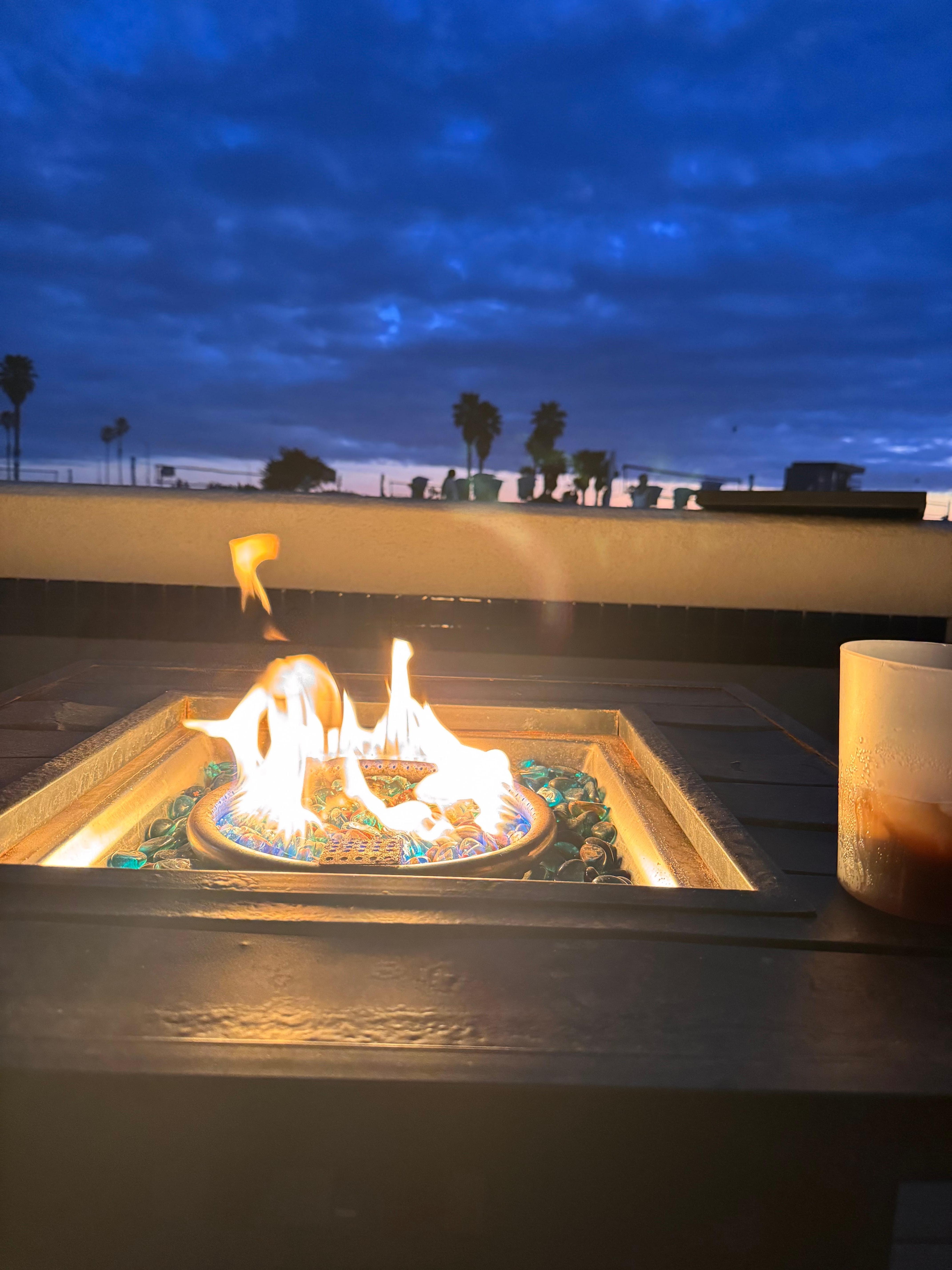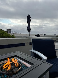 The cozy living room invites you to relax after a beach day, complete with a fireplace, pull-out sofa, and large TV. The fully stocked kitchen makes home cooking easy, and the spacious dining table is perfect for group meals. Step outside to the ocean-facing patio where you can grill, dine alfresco, and unwind by the fire pit as the sun dips into the Pacific.