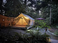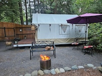 Romantic getaway spend nights in the forest as a guest in our Lavender tent.You enjoy fire pit in the evening, barbeque place for lunch or dinner and water closet with full size shower.We also offer heater inside the tent to feel cozy and warm during your stay.Plenty of blankets if you need for sitting outside using fire pit at night or watching the stars.